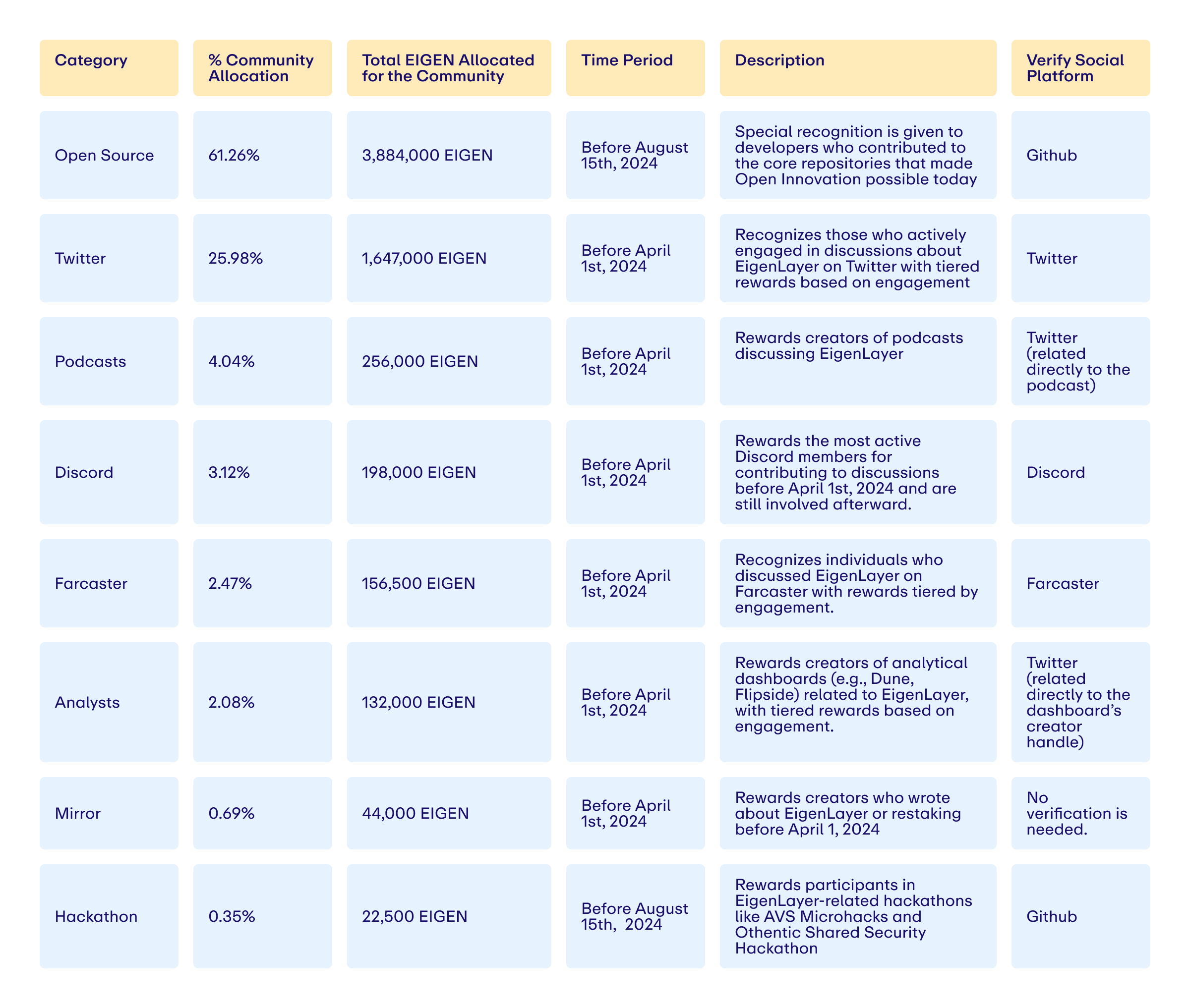 - Community Members: Early advocates, contributors, and projects that have been pivotal in supporting EigenLayer